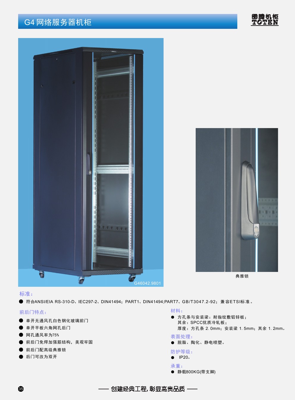 單開白色鋼化玻璃前門;單開鈑金后門;門邊條開條形通風(fēng)孔,網(wǎng)孔通風(fēng)率為75%;前后門免焊加強筋結(jié)構(gòu),美觀牢固;前后門配高級典雅鎖;可配客戶需要的各種鎖;前后門可改為雙開。"/>